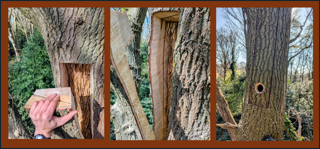 This work is building upon the pioneering research by Jim Mullholland – see here for a video of Jim showing the process for creating a Bechstein’s bat feature. His work has shown that the feature creation is not detrimental to the trees (suitable trees are chosen by the arborists), and the tree seals the extracted wood panel back in place, with the cavity hidden within.