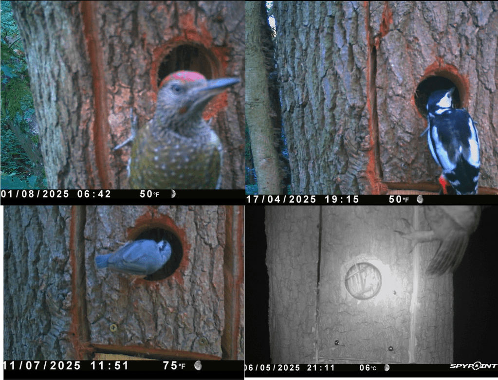 Bird species investigating the bat habitat created by Barnes Common Ltd in Barnes Common, South West London. Photo credits: Stills from video analysed by Will Scott-Mends, Barnes Common Ltd; Clockwise from top-left: Green Woodpecker, Greater Spotted Woodpecker, Tawny Owl, Nuthatch