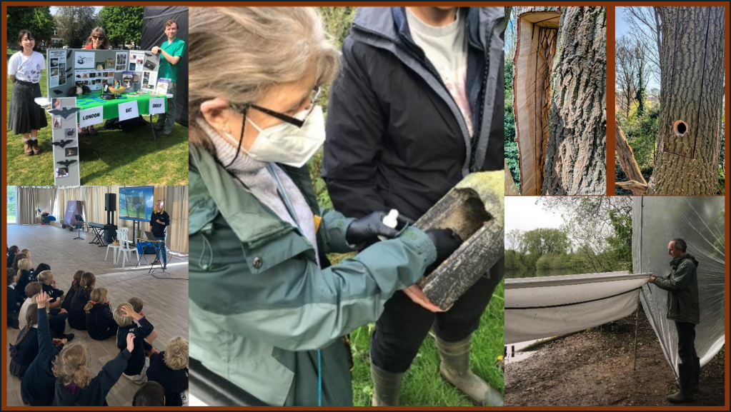 Clockwise from top-left: Wandsworth Eco-fair (photo credit E. Little), installing a data logger into a bat box (C. Montauban), tree cavity habitat creation (W. Dartnell), setting up a harp trap to catch Nathusius’ pipistrelles for tagging (E. Little), engaging school children with the delights of bats (F. Walker).