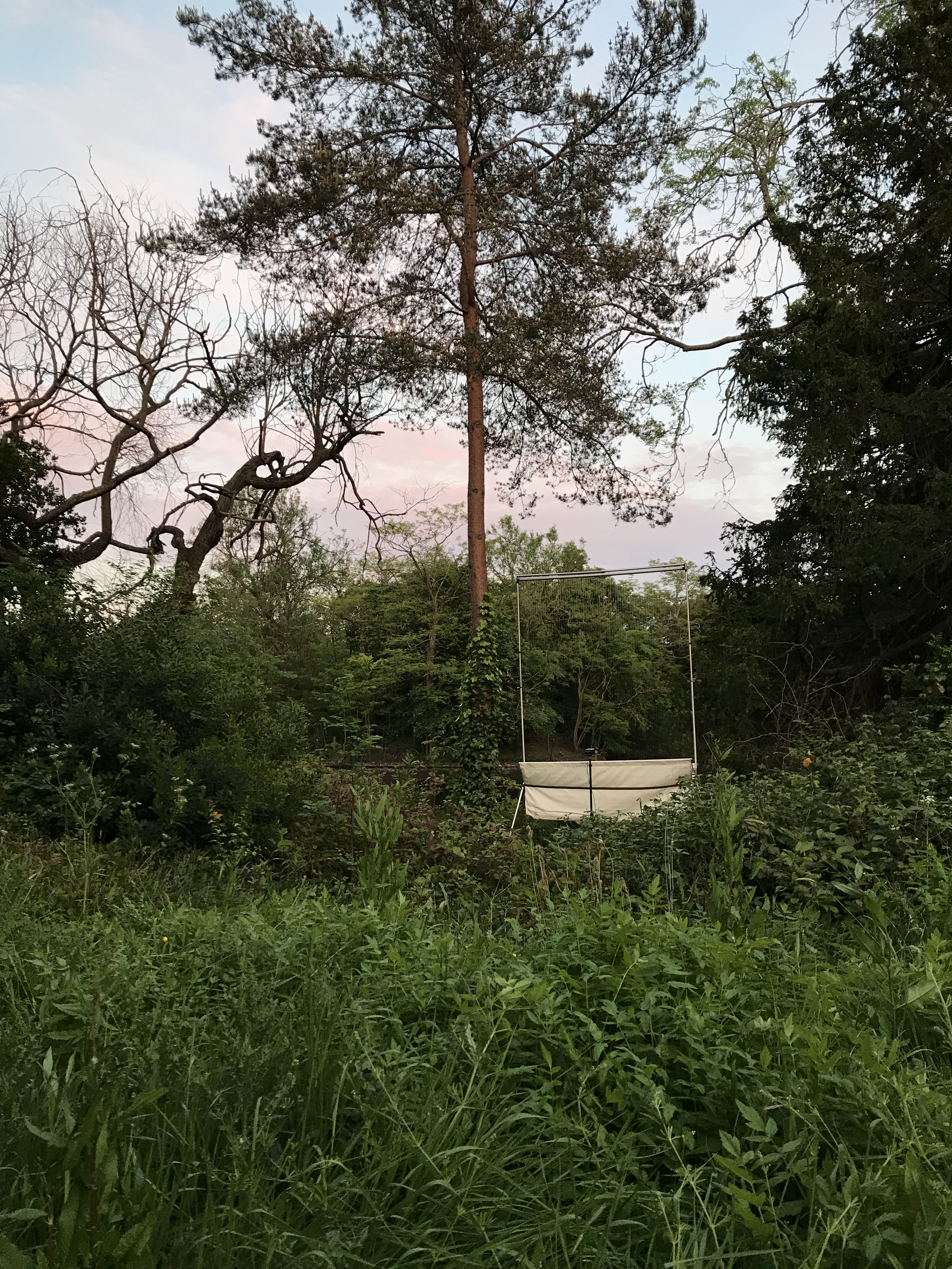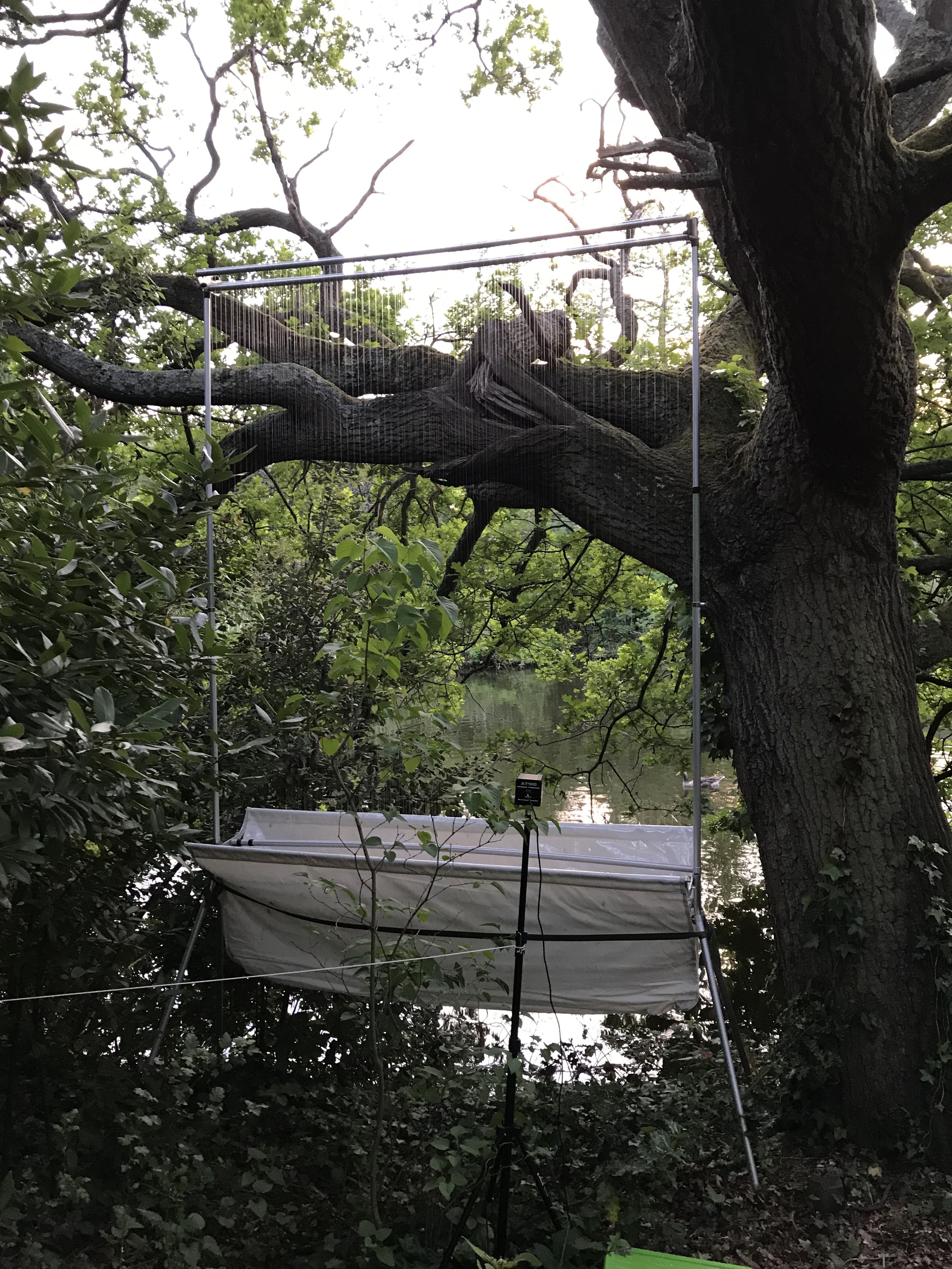 We first identified activity hotspots in London for Nathusius’ pipistrelle through acoustic surveys. We then used this information to select our survey sites. At our selected sites we initially look for suitable location to set up harp traps and lures, ideally this would be close to a body of water and sheltered. (picture of harp trap set up). The survey starts at sunset, we turn the lures on and wait for bats to show up!